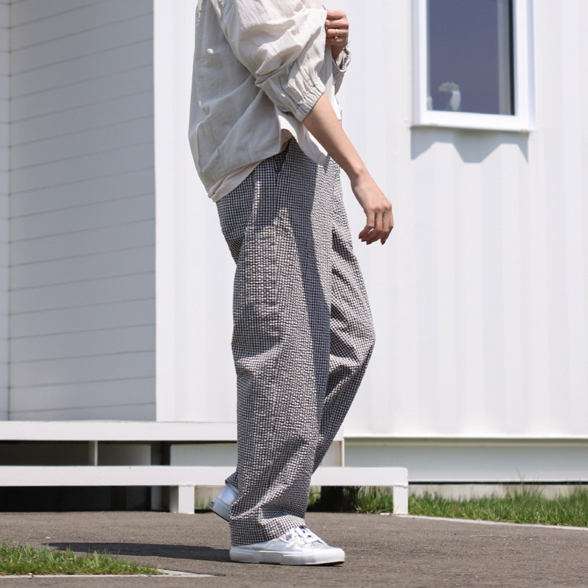 ワークパンツのディティールをベースにサッカー生地で作られたパンツはシルエットの上品さとカジュアルさの雰囲気が絶妙な一本。