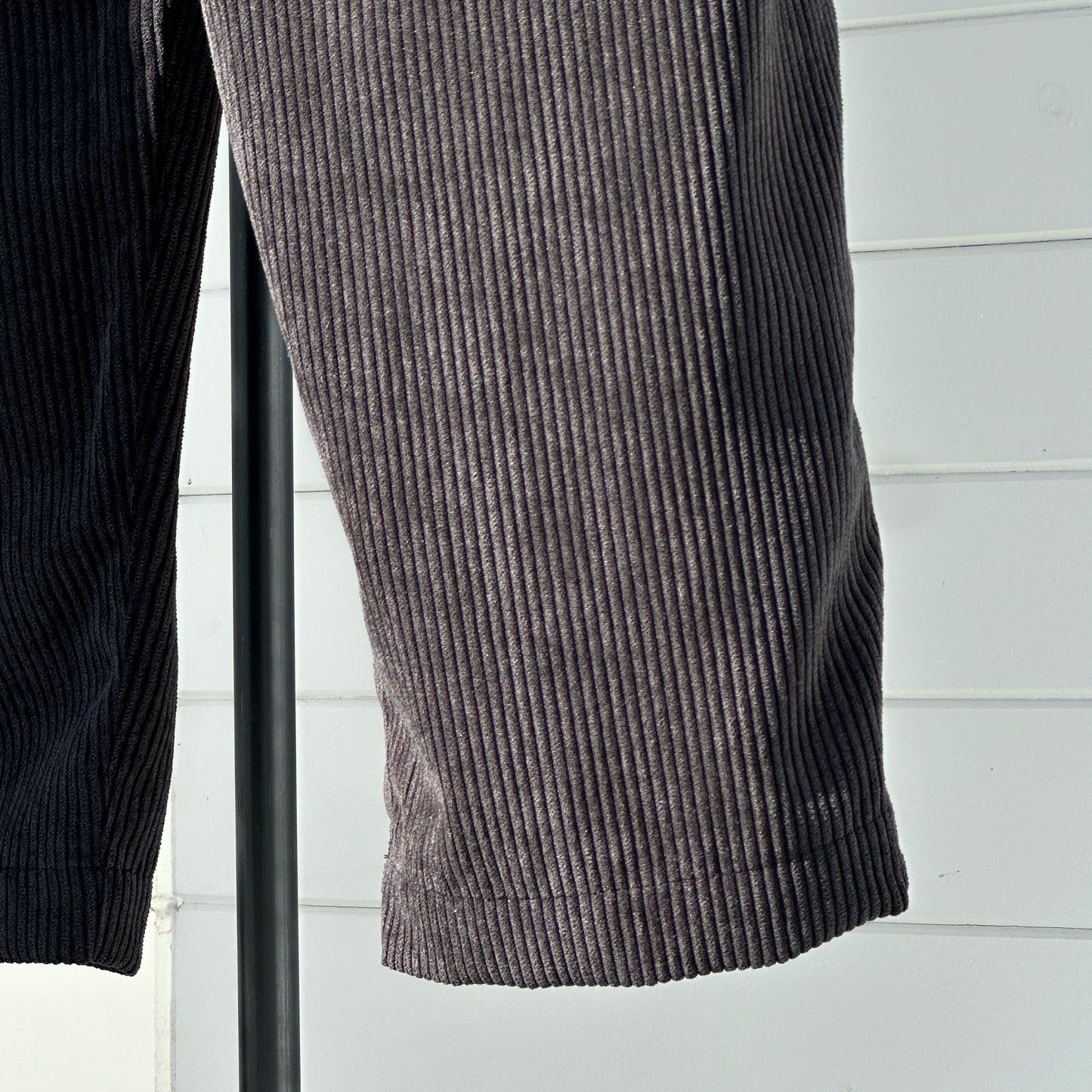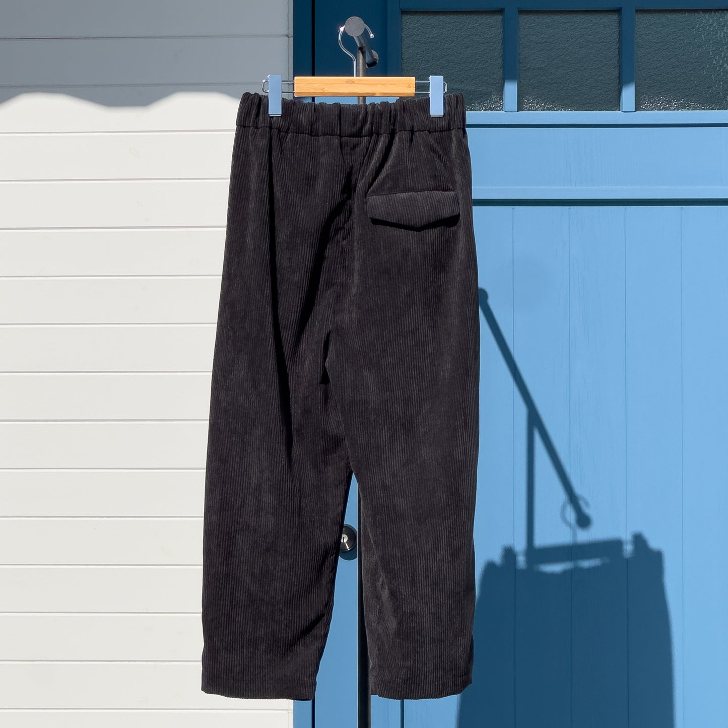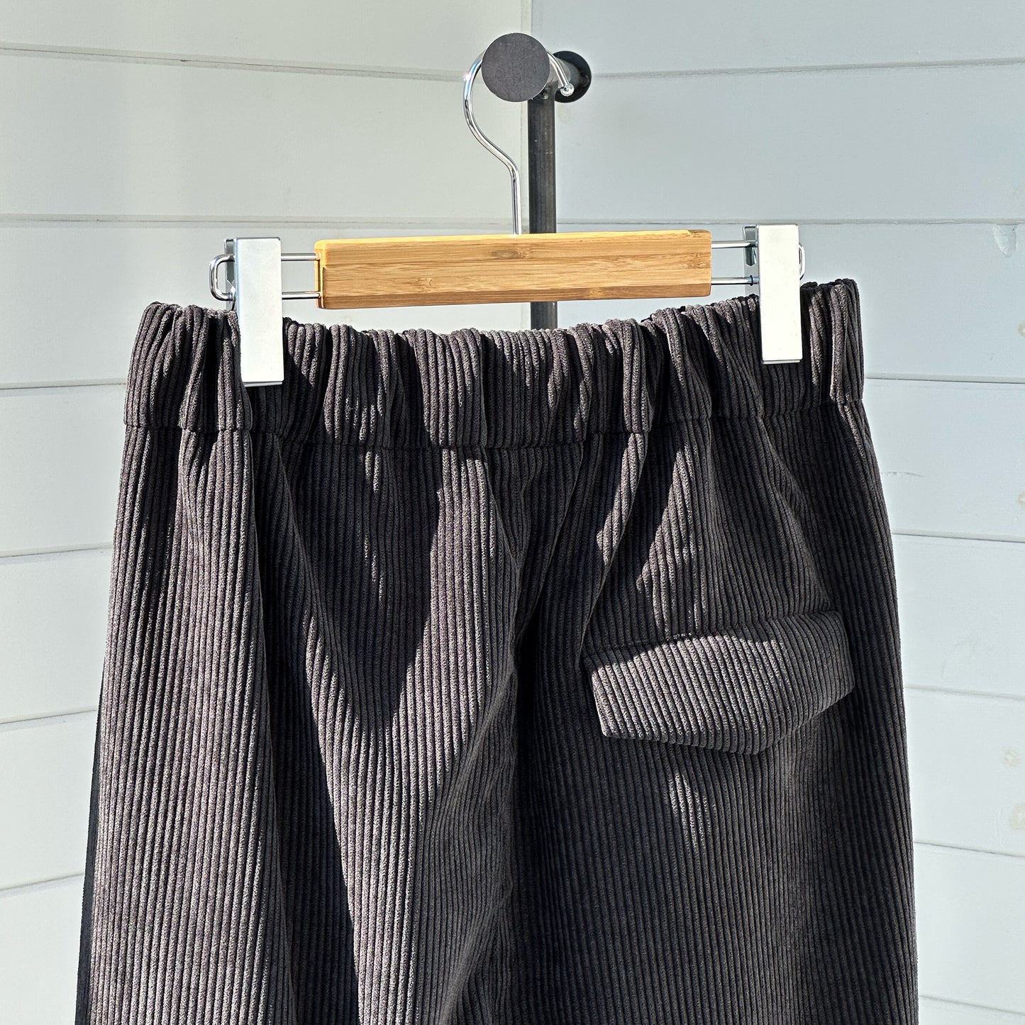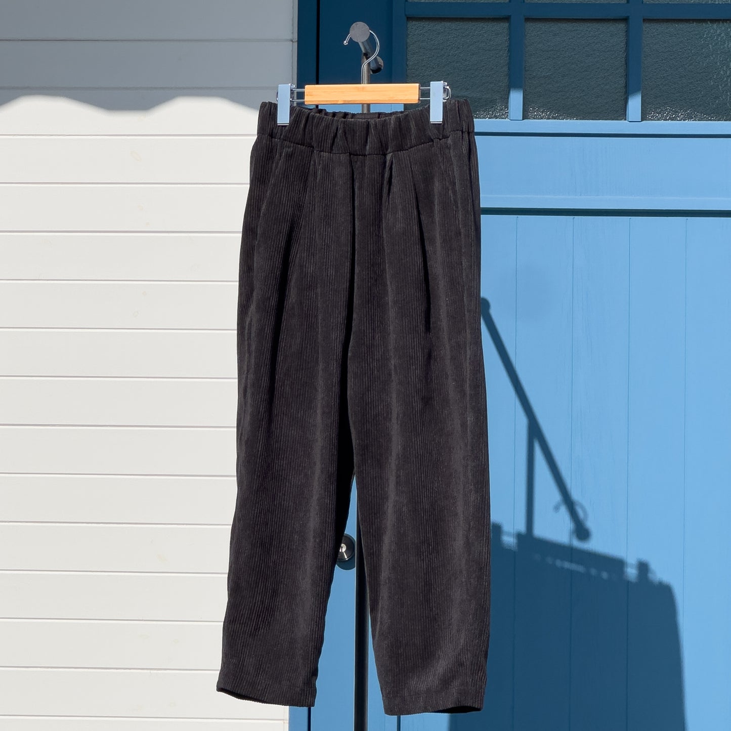 縦糸に150Dのポリエステル 緯糸に320Dのポリエステル/ナイロンの糸を使用したコーデュロイ生地です。綿のコーデュロイに比べるとコシがなく柔らかく落ち感が有ります。形はテーパードシルエット、ウエストはゴム、紐で調節可能です。