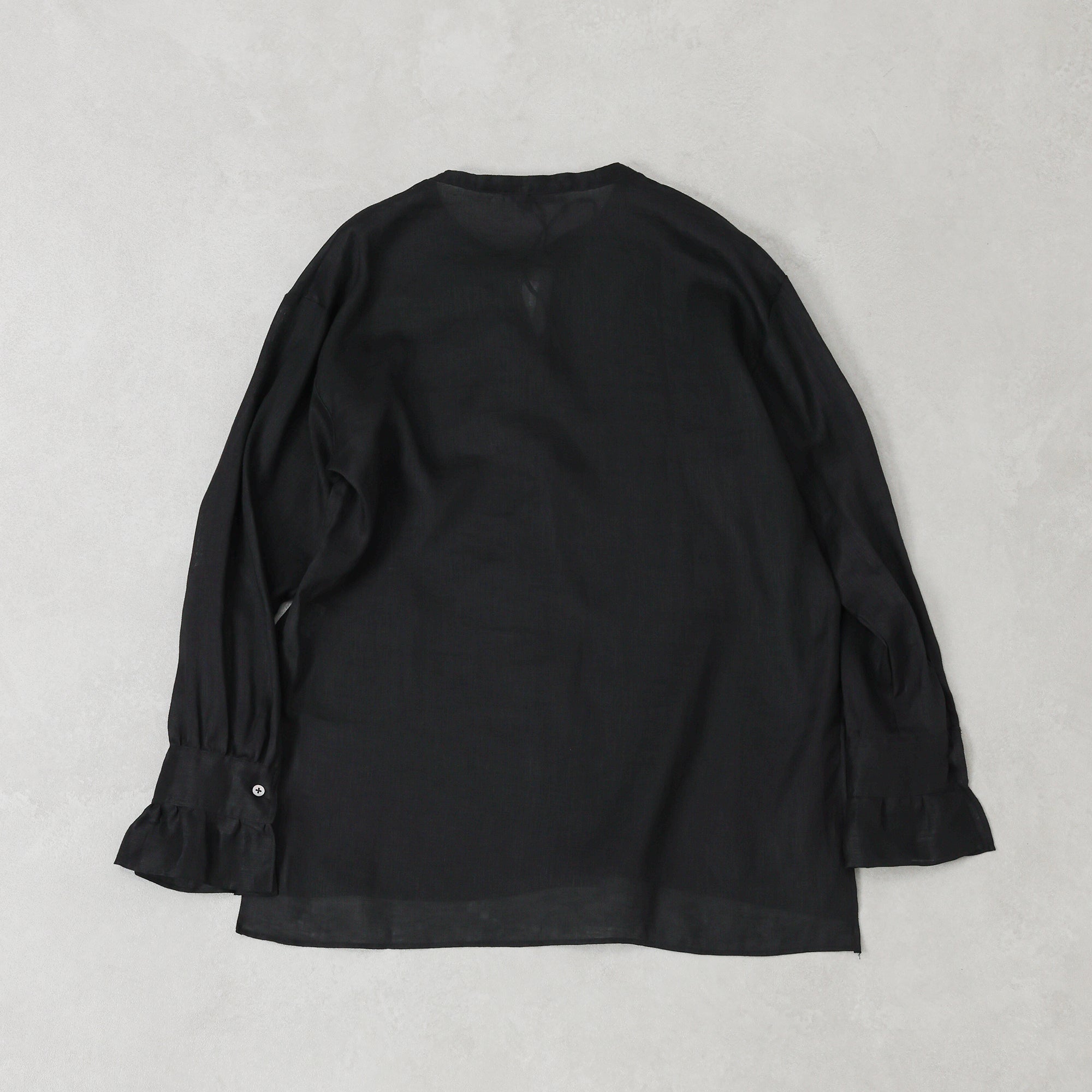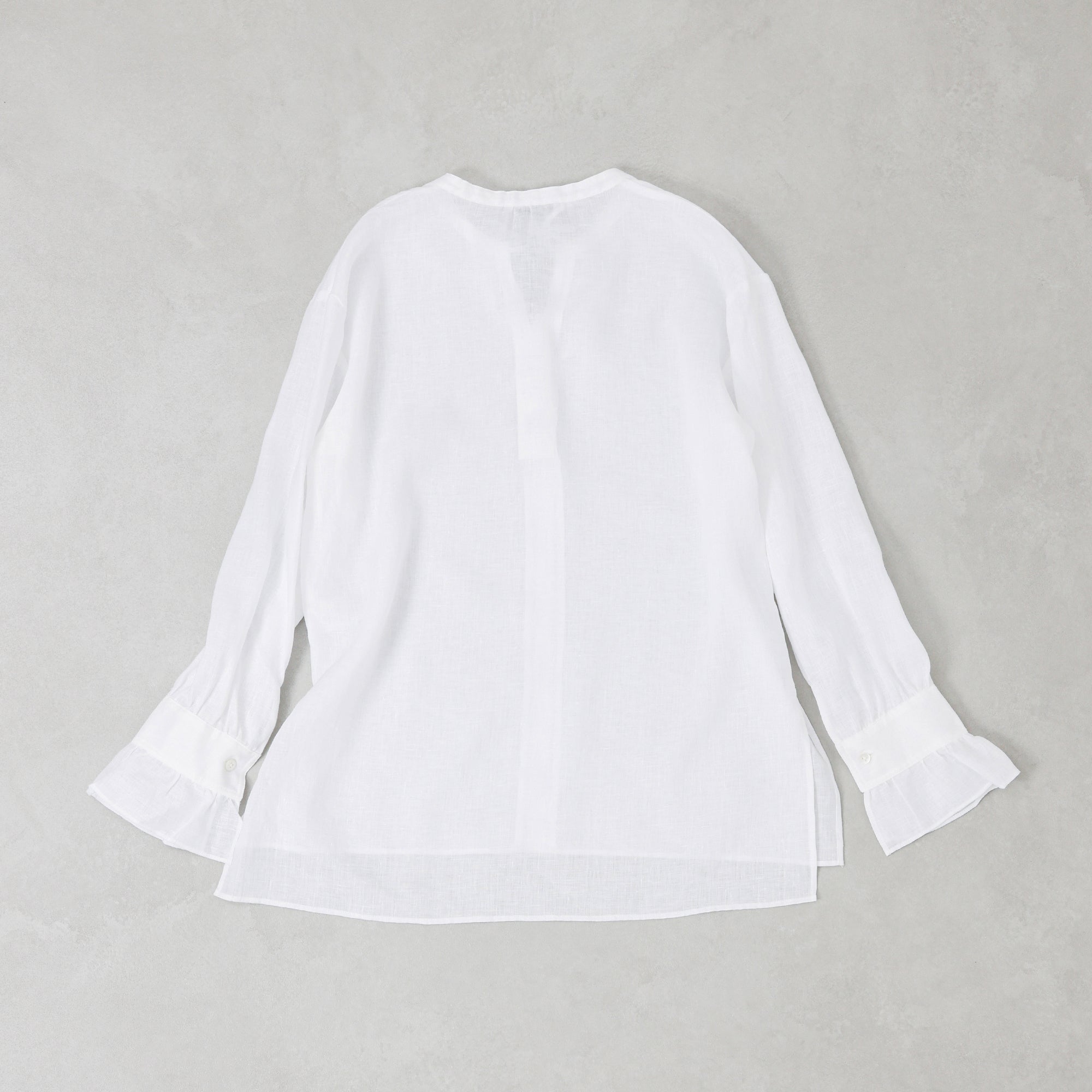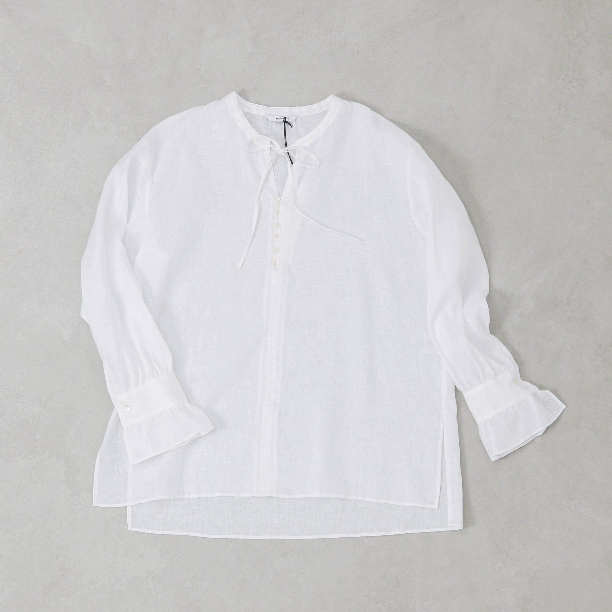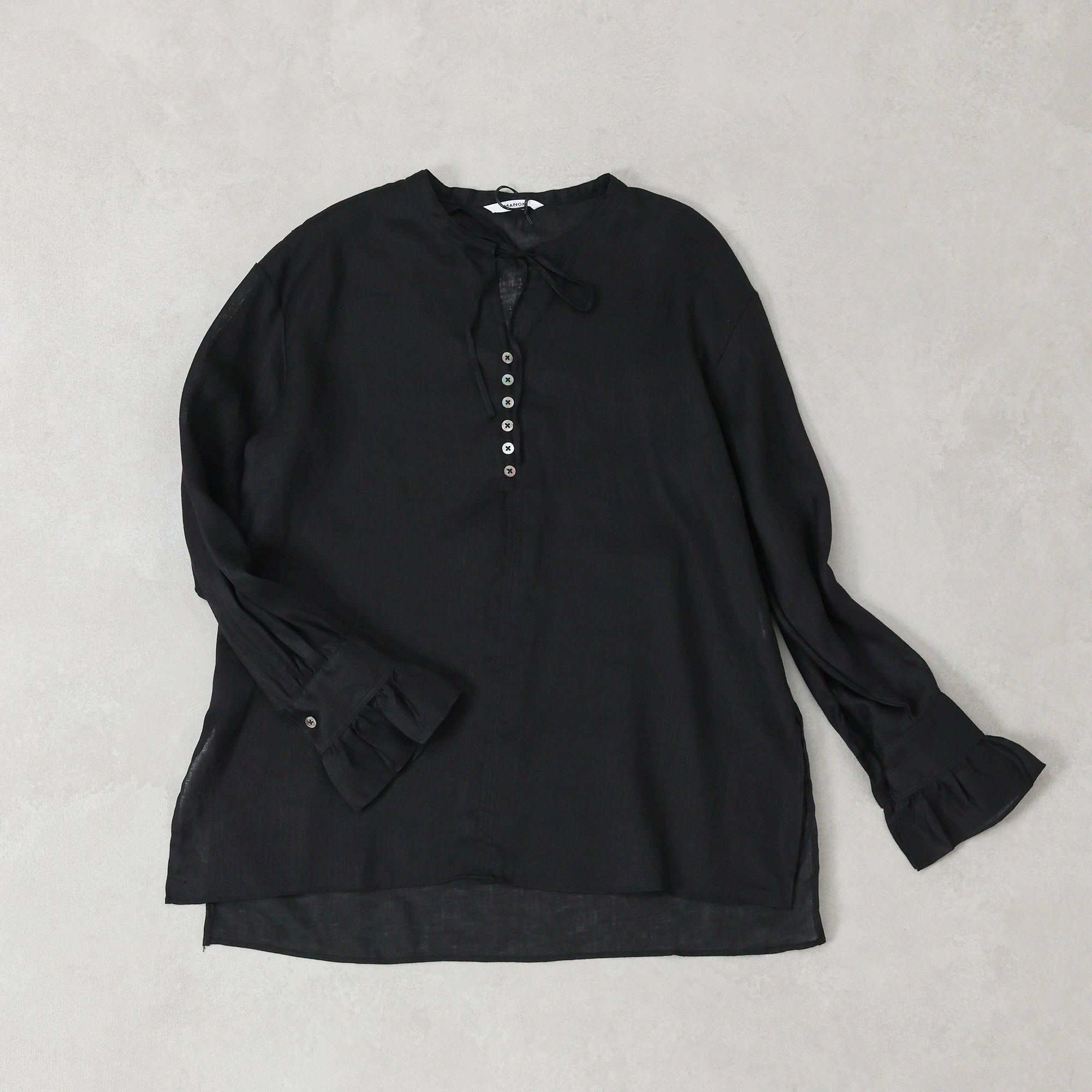 衿に通した共布リボンと天然貝釦がアクセントのふんわりとした袖とカフスのフリルで女性らしくエレガントに仕上げたプルオーバーブラウスです。