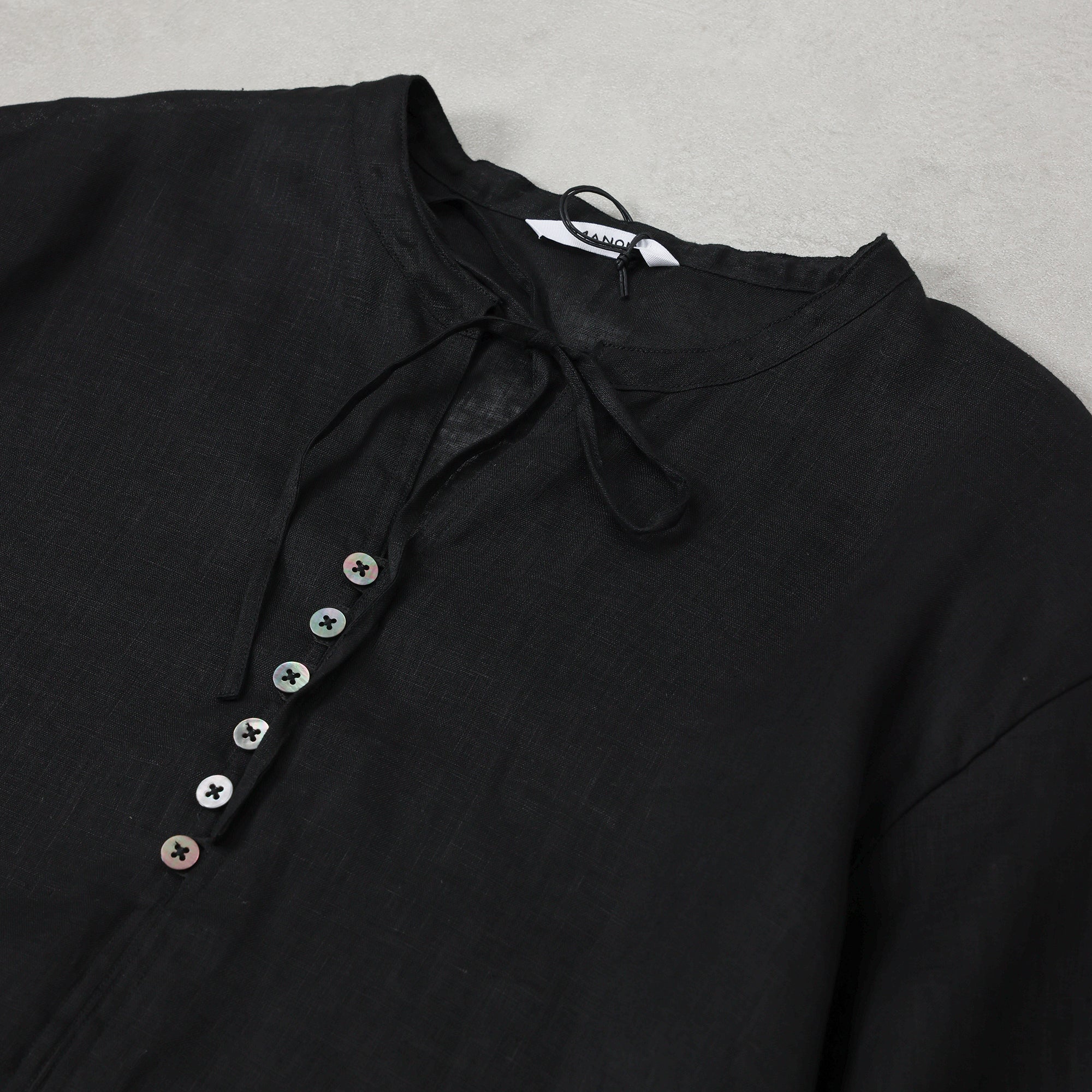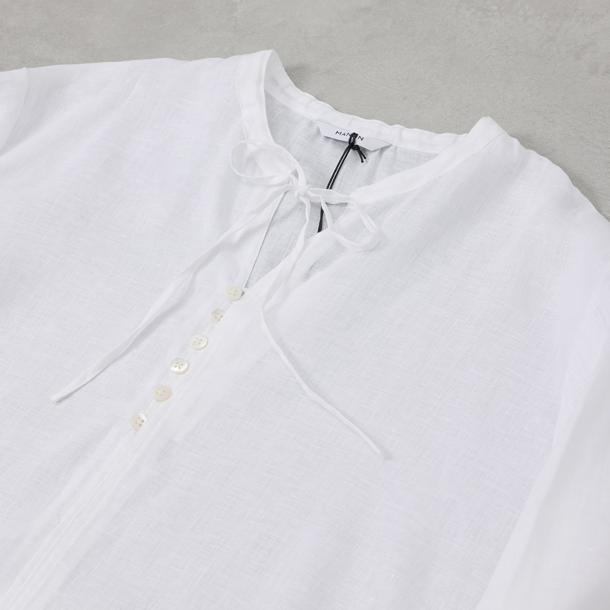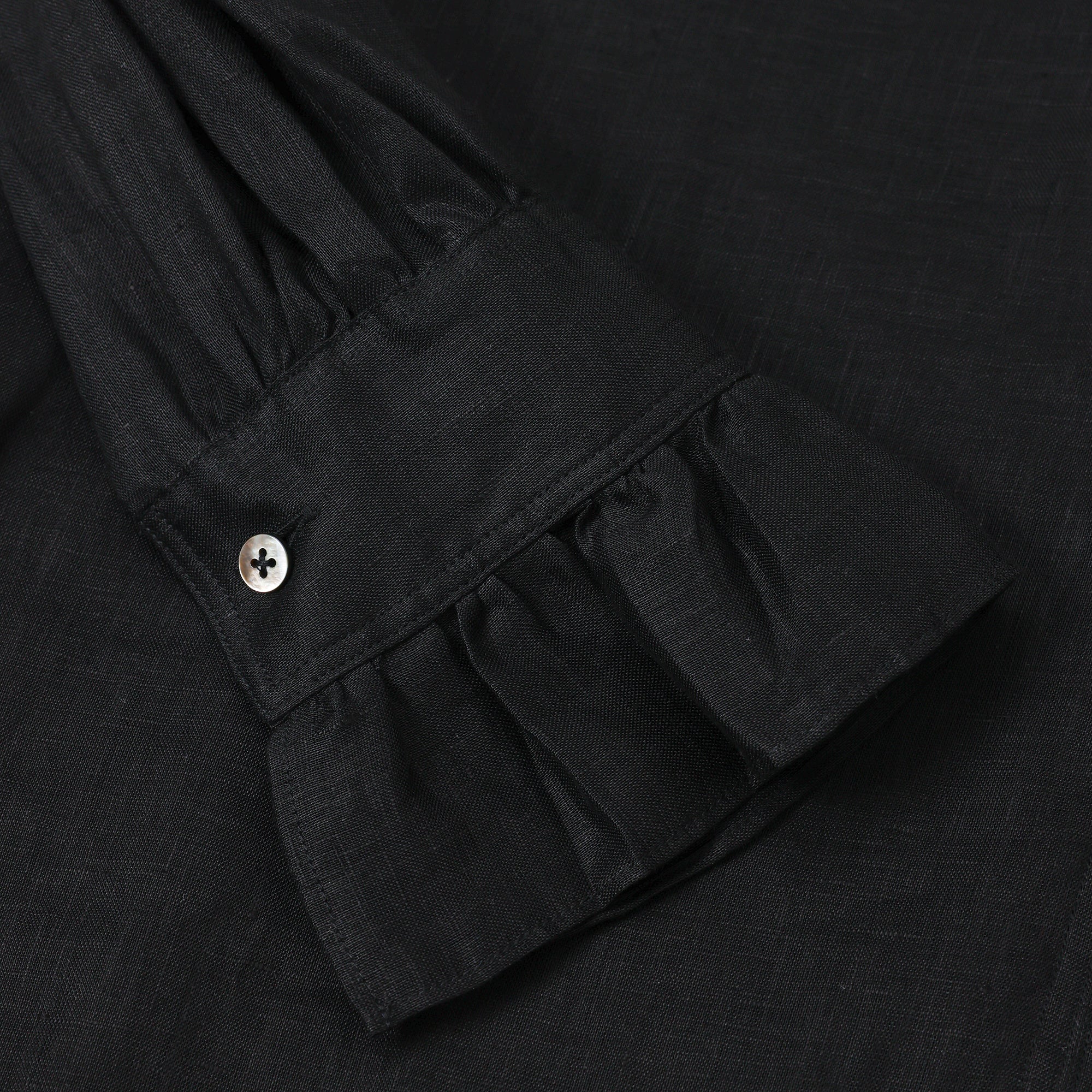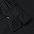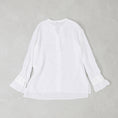 衿に通した共布リボンと天然貝釦がアクセントのふんわりとした袖とカフスのフリルで女性らしくエレガントに仕上げたプルオーバーブラウスです。