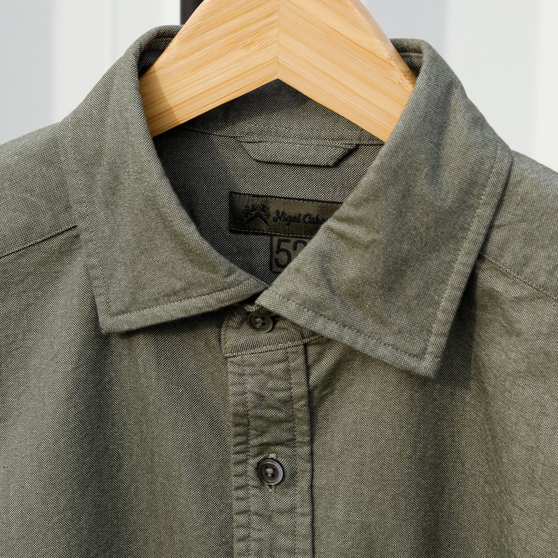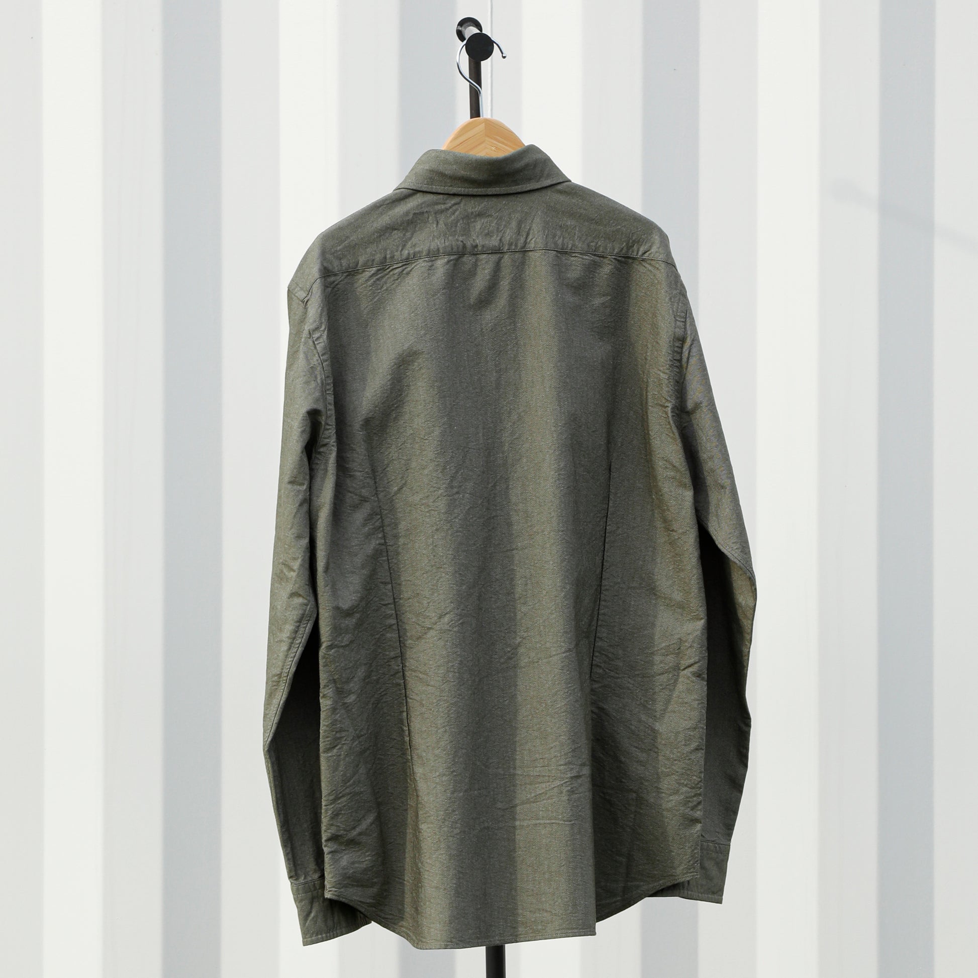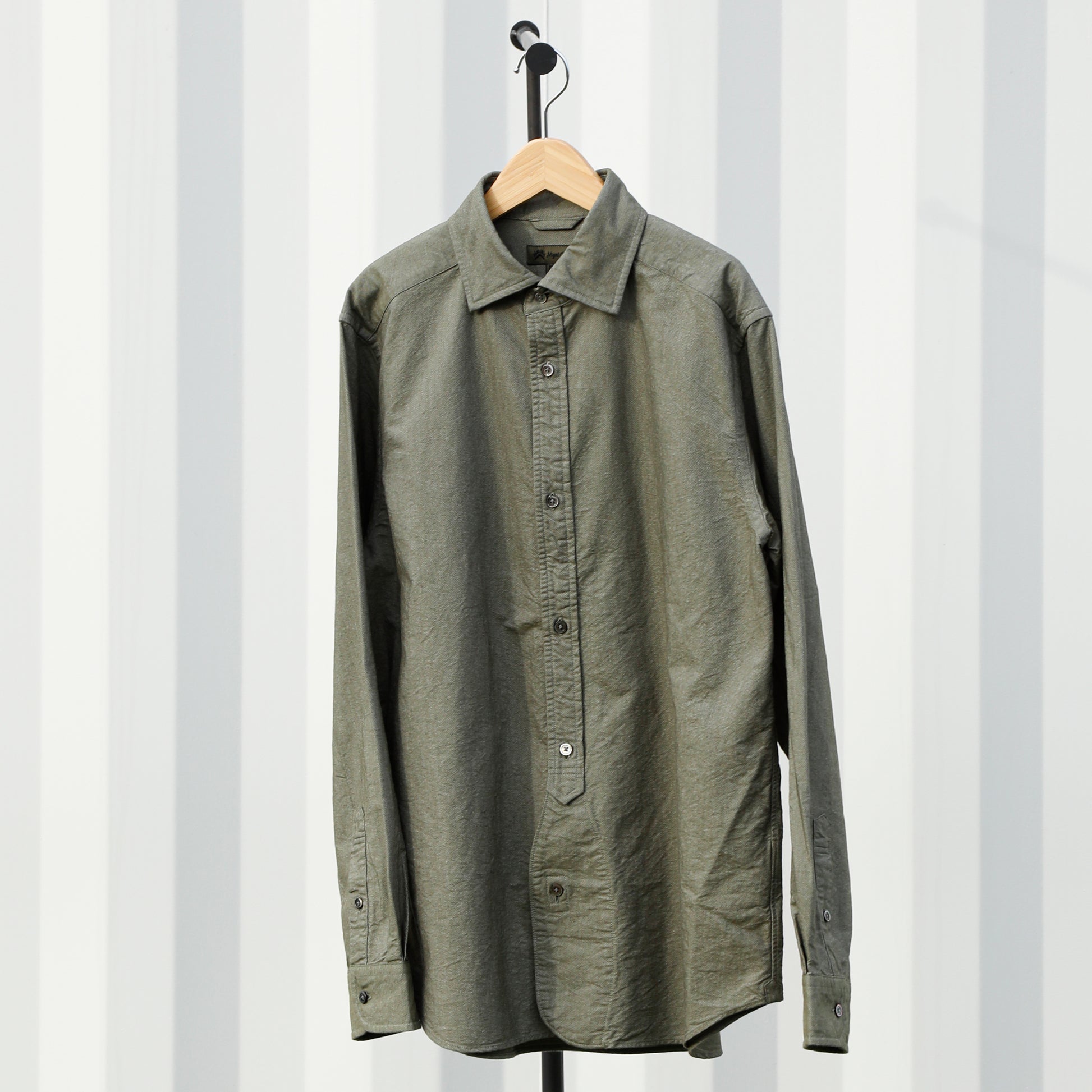 糸を構成するコットン短繊維のチョイスとブレンドからスタートし、糸造りである紡績からオリジナルで取り組んだ緯糸を使った定番シャツ。